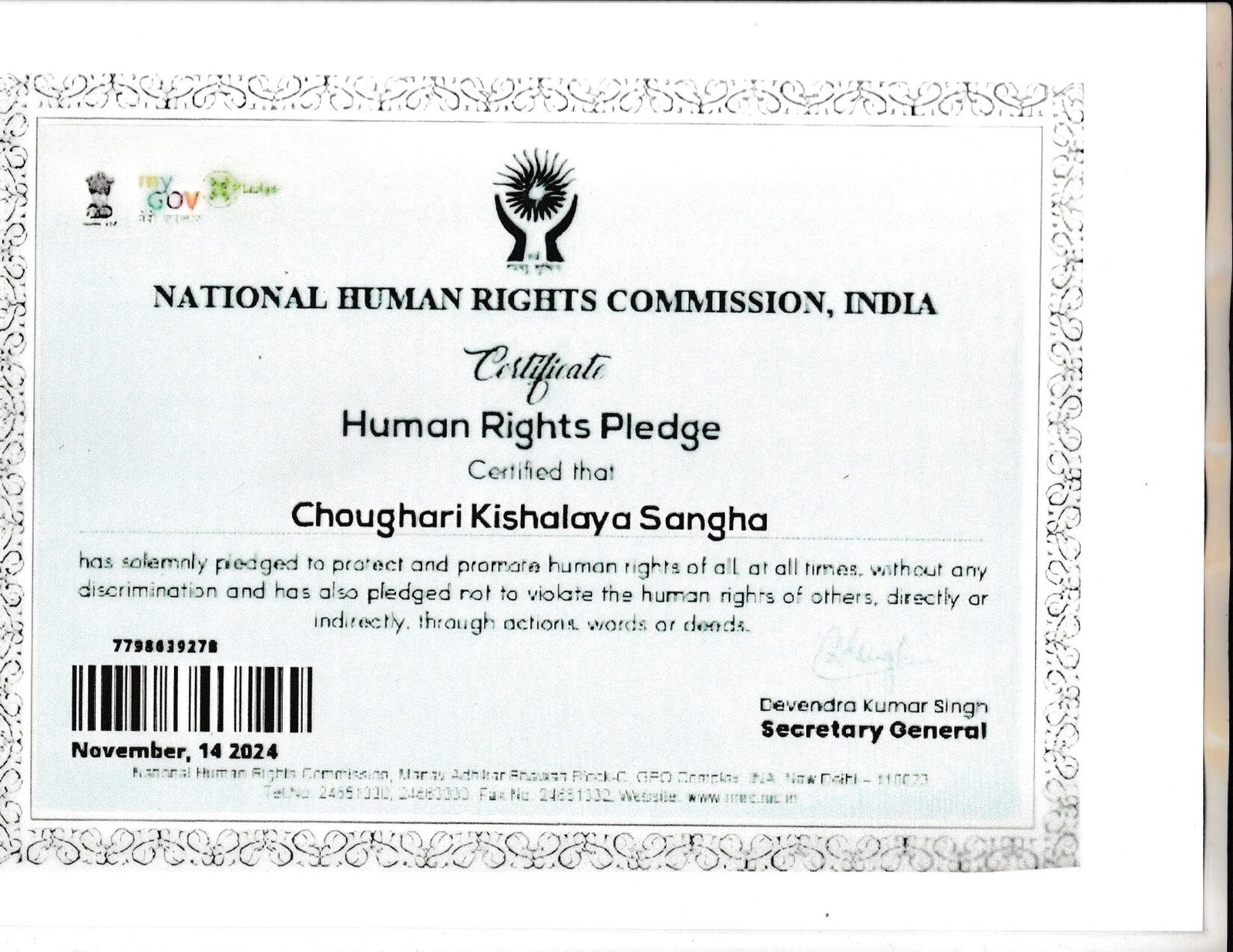 Choughari Kishalaya Sangha was established in 1980 and is registered under the Indian Society Act, 1880 (Registration No. S/28465). The organization is also registered with NITI Aayog (NGO Darpan Portal) and holds 12A, 80G, CSR-1, and FCRA registrations, ensuring transparency and credibility in community development work.